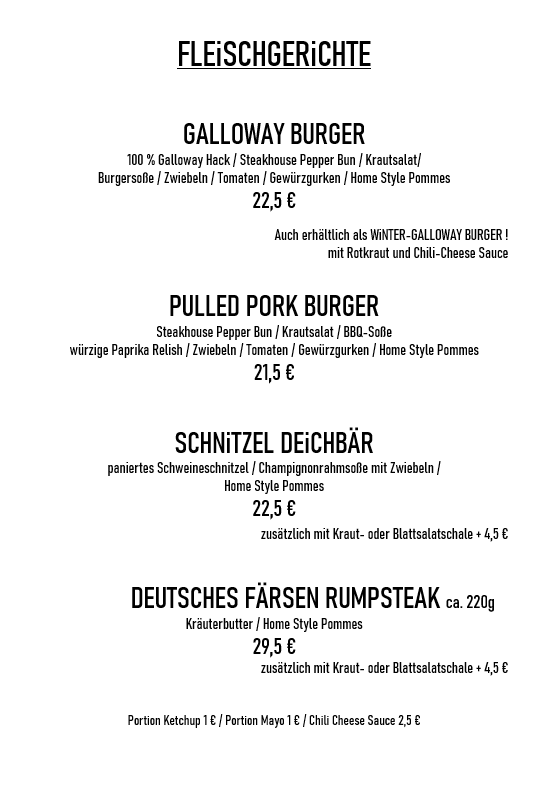 Wir servieren typisch schleswig-holsteinische Fischgerichte, sowie Burger und hausgemachte Desserts.